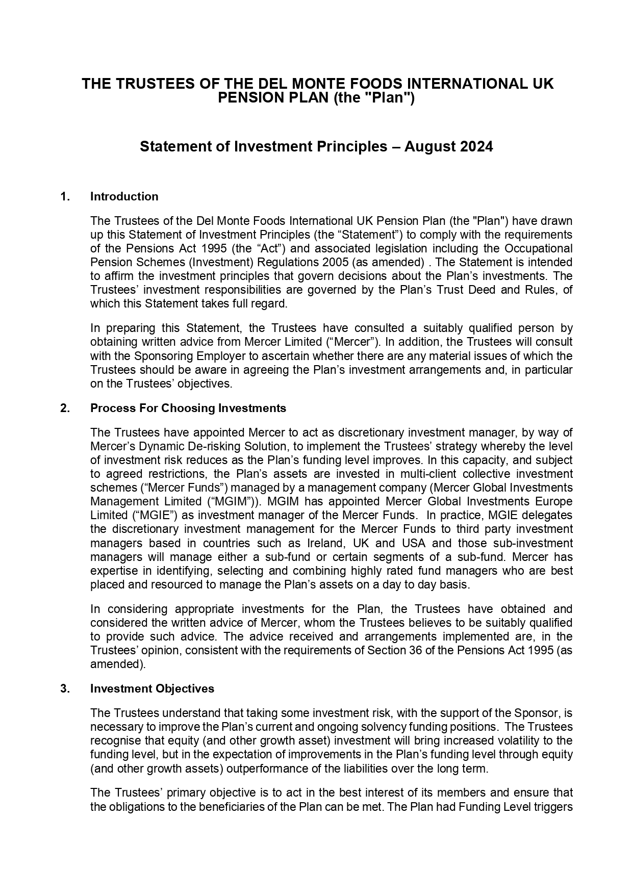 DMFI UK Pension Plan – Statement of Investment Principles